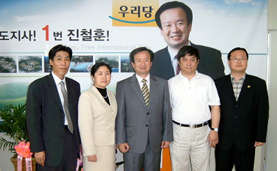 5.31제주도지사 선거 열린우리당 제주도지사 진철훈 후보가 24일 오전 선거 캠프를 내방한 중국 4대 일간지 중 하나인 공산당 기관지 진완바오(今晩報)의 구지엔신(顧建新) 상임논설위원 겸 편집국장과 홍콩 에너지그룹 무역회사(천진기업인연합회)의 유얀펑 간사 등과 환담을 나누었다.<사진>