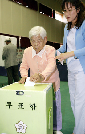투표하는 최고령 유아지할머니./사진=이승철기자