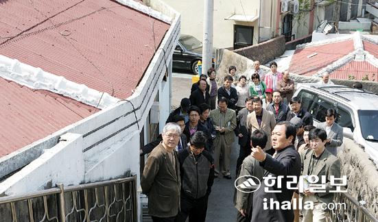 ▲지난 7일 제주시 건입동을 방문한 본보 마을만들기팀과 건입동 주민자치위원회 관계자들이 워크숍을 하기에 앞서 마을 곳곳을 둘러보며 숨겨진 자원들을 답사했다. /사진=강경민기자 gmkang@hallailbo.co.kr