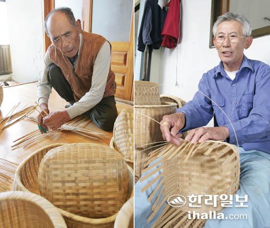 ▲오랜 세월 구덕과 차롱을 걸어온 제주시 도련2동의 변규서씨(왼쪽)와 서귀포시 호근동의 김희창씨, 뻣뻣한 대나무를 자르고 다듬어 날줄씨줄로 엮어 짜며 맵씨나는 바구니를 만들어내는 이들의 손가락은 성할 날이 없다. /사진=김명선기자 mskim@hallailbo.co.kr