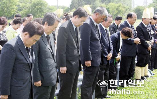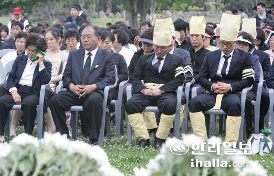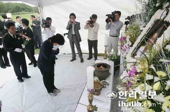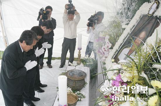 지난 16일 히말라야 고봉에서 세상을 등진 ‘희말라야의 괴물’ 고(故) 오희준 부대장을 추모하는 노제가 29일 오전 한라산 관음사 야영장에서 진행된 가운데 유족들이 헌화 분향하고 있다. /사진= 이승철기자