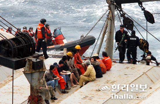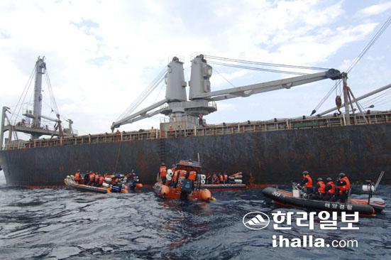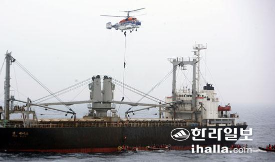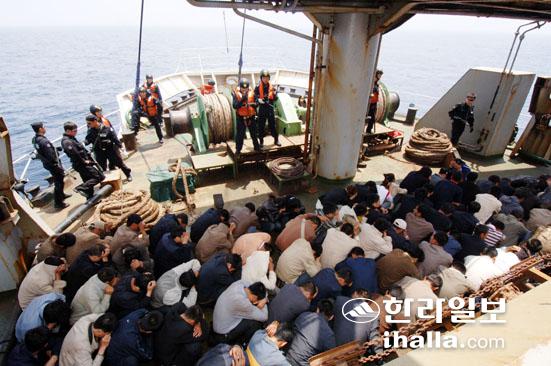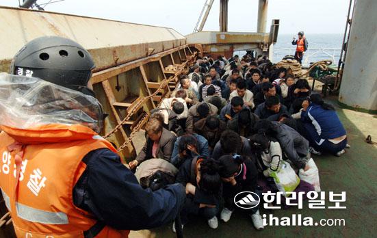 4일 제주항 북방 13km 행상에서 중국인 밀입국자 88명을 태우고 밀입국을 시도하던 제주 선적 5천t급 화물선을 제주해양경찰서 소속 경비함, 보트 헬기등의 동원돼 검거활동을 벌이고 있다. /사진= 이승철기자