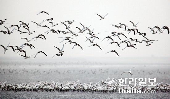 ▲치쿠습지에서 휴식중인 저어새 무리 위에 붉은부리큰제비갈매기가 날아가고 있다. /사진=강희만기자 hmkang@hallailbo.co.kr