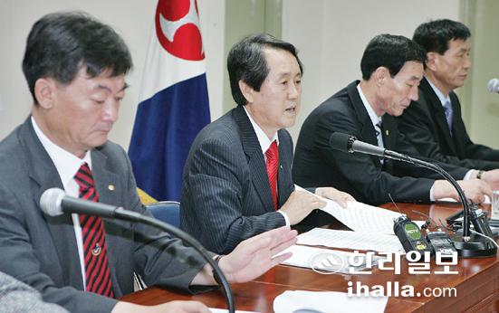 ▲김태환 제주도지사(왼쪽 두번째)와 세계유산위원회 제주대표단 및 정부대표단으로 공식 참석하는 강만생 본사 사장(맨왼쪽)은 25일 유네스코 세계자연유산 등재 출정 기자회견을 통해 "제주에 또 하나의 새 역사를 이룰 수 있도록 도민 여러분의 많은 성원을 부탁드린다"고 말했다. /사진=김명선기자 mskim@hallailbo.co.kr