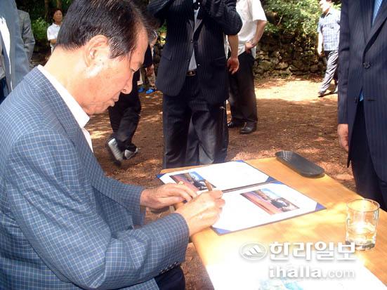 자연유산 등재를 위해 서명하는 김대중 전 대통령.