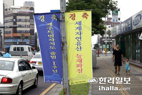 제주 화산섬과 용암동굴이 27일 세계자연유산으로 등재되면서 이를 축하하는 배너와 걸개 현수막, 홍보탑이 서귀포시내 곳곳에 설치됐다.