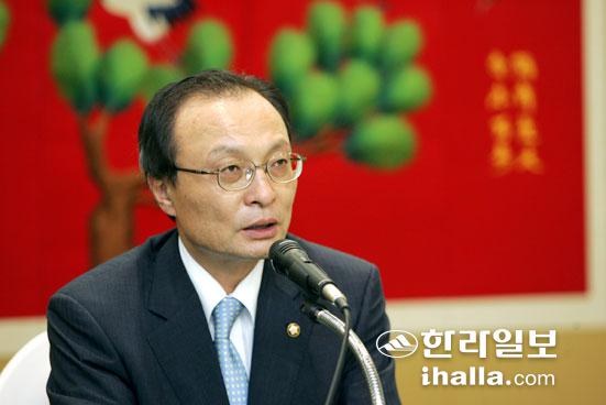 열린우리당 대선주자인 이해찬 전 총리는 23일 기자간담회에서 제주특별자치도의 헌법적 지위보장에 반대하며 국가적 이익을 위해 해군기지는 필요하다고 밝혔다./사진=강경민기자