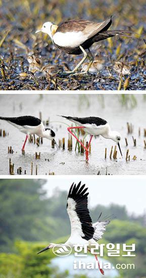 ▲용수리 지역에서 볼 수 있는 철새들. 위로부터 번식에 성공한 물꿩, 장다리물떼새, 황새.