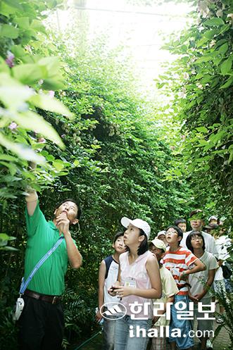 ▲한림공원을 견학한 어린이들이 안내직원으로부터 나무들과 식물들에 대해 설명을 듣고 있다. /사진=강경민기자