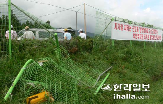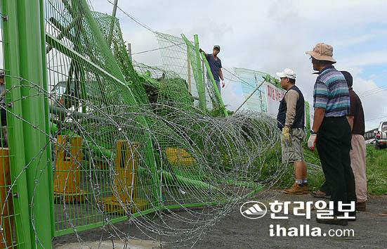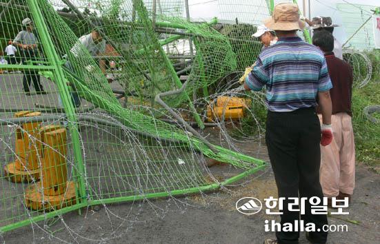 이날 동원된 중장비로 파손된 관음사 울타리.