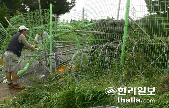 신도들이 파손된 울타리를 고치고 철조망을 설치하고 있다.