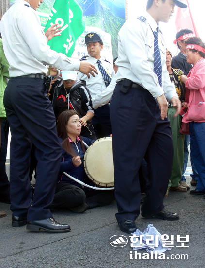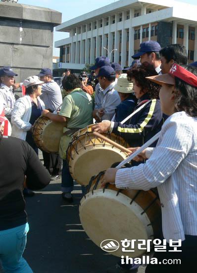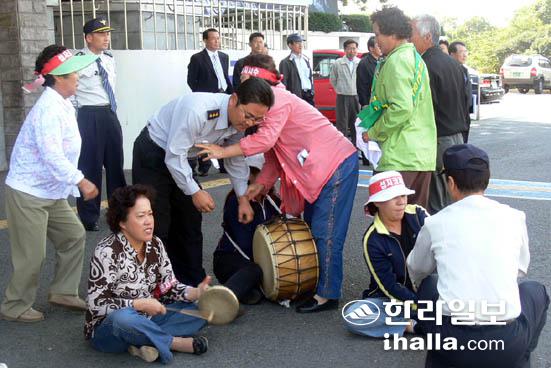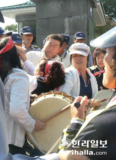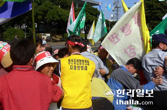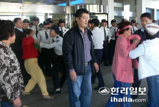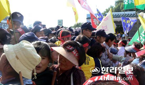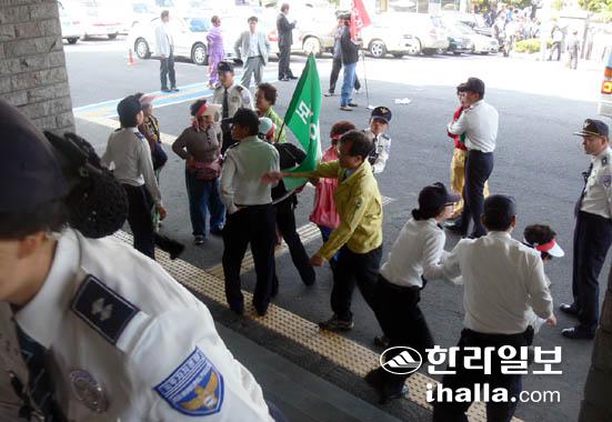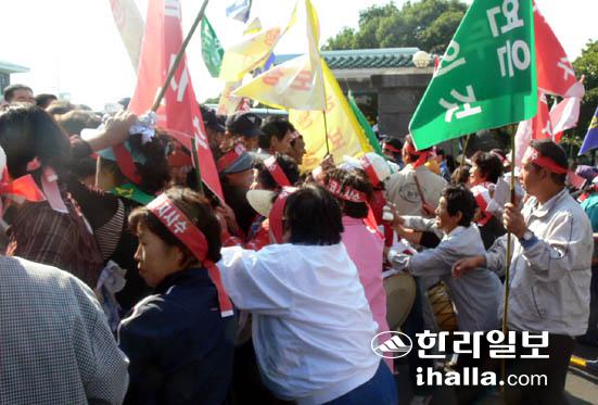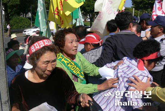 15일 오후 2시 제주특별자치도청 앞에서 성산 섭지코지 사수를 위한 규탄대회가 열린 가운데 지역주민들과 제주도청 청경 및 경찰간 격렬한 몸싸움이 벌어졌다. /사진=강봄기자