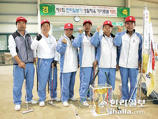 ▲17일 제주 전천후 게이트볼구장에서 막을 내린 제9회 한라일보기 생활체육 게이트볼대회의 우승팀인 곽지팀이 승리를 자축하는 파이팅을 외치며 기념촬영하고 있다. /사진=김명선기자 mskim@hallailbo.co.kr