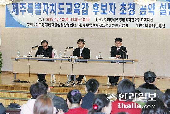 ▲교육감 출마자인 신영근후보와 양성언후보는 13일 제주장애인자립생활환경연대등이 주최한 공약설명회에 참석해 장애인가족 표심 끌어안기에 총력을 기울였다. /사진=김명선기자