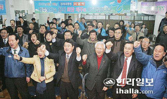 ▲19일 오후 17대 대통령 선거에서 한나라당 이명박 후보가 각 방송사 출구조사 결과, '압승'했다는 보도가 일제히 나오자 한나라당 제주도선대위 사무실은 떠나갈듯한 환호성이 이어졌다. /사진=강경민기자 gmkang@hallailbo.co.kr