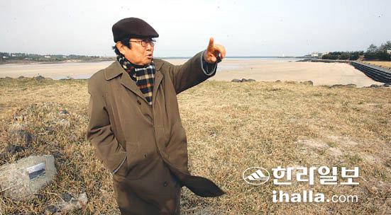 ▲소설 '한 공산주의자를 위하여'의 주명구는 조몽구의 실제 생애처럼 표선백사장에서 4남매와 아내를 끔찍하게 잃었다. 소설가 오성찬씨가 먼 발치에서 그 날의 현장을 바라보고 있다. /사진=김명선기자mskim@hallailbo.co.kr