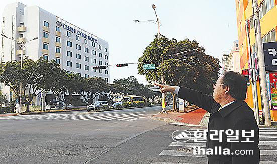 ▲콘크리트 건물 숲으로 둘러싸인 제주시 연동의 거리. 4·3때 성담을 쌓아 원처럼 한바퀴 둘렀던 곳이지만 지금은 그 흔적을 찾아보기 어렵다.