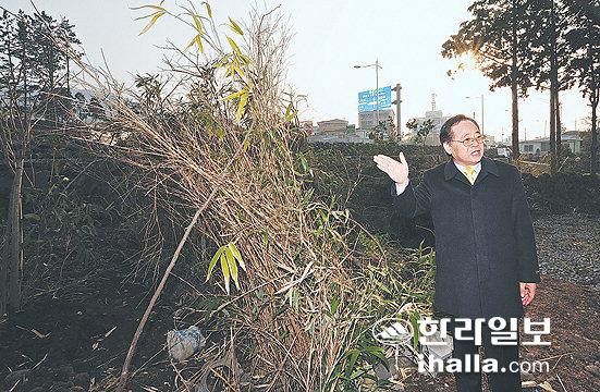 ▲신제주초등학교 남쪽 옛 집터를 찾은 오영호 시인. 불타버린 집을 뒤로 하고 인근에 성을 쌓아 마을 사람들이 모여살았다. 듬성듬성 남아있는 대나무가 그 시절을 어렴풋이 기억할 뿐이다. /사진=이승철기자 sclee@hallailbo.co.kr