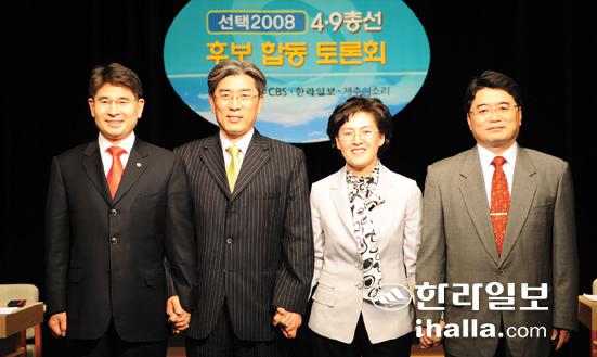 ▲한라일보 등 도내 4개 언론사가 주최한 4·9총선 서귀포시 선거구 예비후보 합동토론회가 20일 오전 KCTV 제주방송에서 열렸다. 왼쪽부터 김재윤, 정구철, 현애자, 강상주 후보. /사진=이승철기자