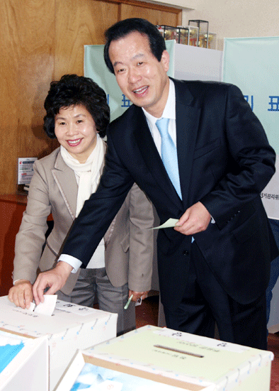 제18대국회의원선거 제주시 갑 선거구에 출마한 한나라당 김동완 후보가 부인 이영희씨와 함께 9일 오전 한림 2리 투표소에서 투표했다.