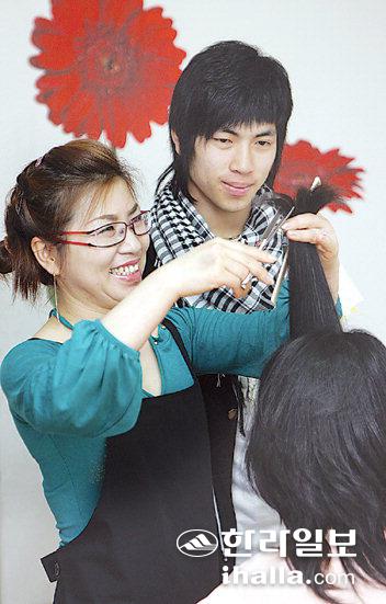 ▲김호진씨에게는 어머니 현경애씨가 든든한 후원군이다. 현씨가 미용실을 찾은 고객의 머리를 손질해 주면서 요령을 설명해 주고 있다. /사진=김명선기자