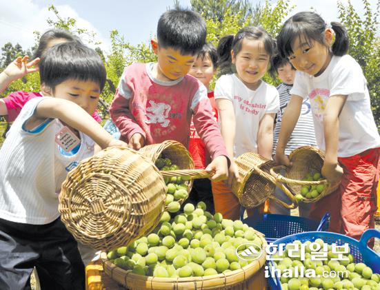 ▲이달 초 서귀포시 신례리에 위치한 자연생활공원인 '휴애리'에서 마련한 매실따기 체험에 참가한 어린이들이 매실을 직접 따서 바구니에 옮겨담고 있다. /사진=한리일보 DB