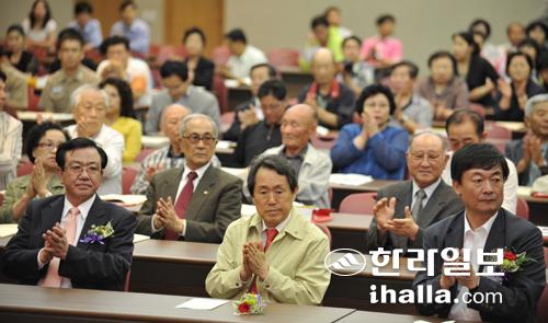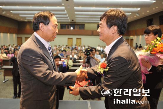 ▲제15회 한라환경대상 시상자를 발표하자 참석자들이 박수를 치고 있다.(앞줄 왼쪽부터 강창식 도의회 부의장, 김태환지사, 강만생 한라일보 사장)/사진=강경민 기자