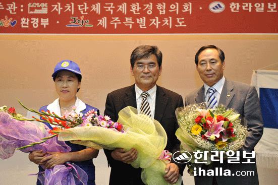 ▲18일 제주국제컨벤션센터에서 개최된 제15회 한라환경대상 시상식에서 바르게살기운동 용담1동위원회(위원장 강옥춘)가 환경대상, 보목초등학교(교장 강시백)가 단체부문 최우수상, 양송남씨(한라산국립공원 관리부)가 개인부문 최우수상을 수상했다(사진 왼쪽부터).