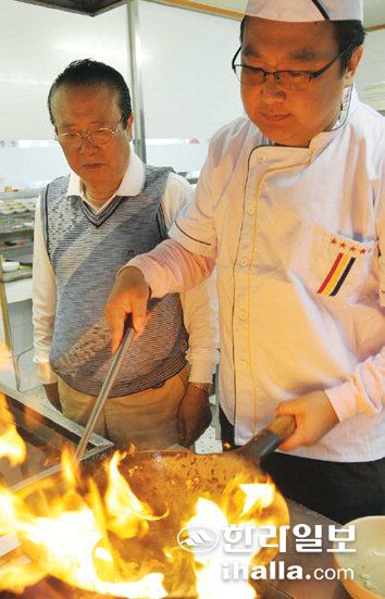▲'원 덕성원'을 지키고 있는 큰 아들 옥해씨가 요리하는 모습을 아버지 왕복안씨가 지켜보고 있다. /사진=강경민기자 gmkang@hallailbo.co.kr