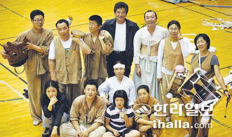 ▲놀이패 한라산 단원들이 '세경놀이' 공연을 끝낸 뒤 한자리에 모였다. 맨뒷줄에 일어선 이는 왼쪽부터 홍진철 여상익 김영진 김경훈 우승혁 최희영 윤미란씨. 앞줄 앉은 이는 왼쪽부터 고혜숙 강창훈 (한사람 건너)부진희씨. 두번째줄 앉은 이는 한송이씨. /사진=강경민기자
