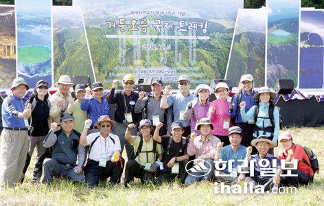 ▲제주산악연맹 부설 한라산등산학교 졸업생들과 산악인들은 거문오름 국제트레킹에 참가한 탐방객들의 안전에 일익을 담당하고 있다. /사진=강경민기자
