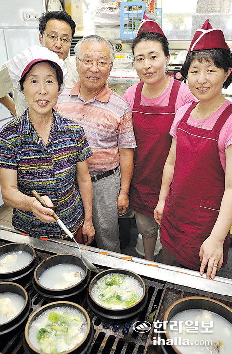 ▲어머니 김순화씨(왼쪽)가 손님이 주문한 메로지리를 만들고 있다. 아버지 이승조씨, 둘째딸 이안나씨, 첫째딸 이란희와 사위 김용인씨(뒷쪽)가 함께 촬영에 응했다. /사진=강경민기자 kmkang@hallailbo.co.kr