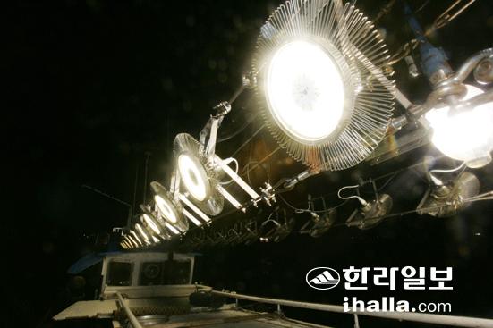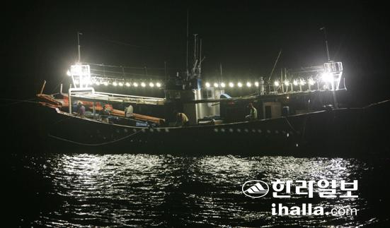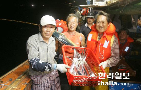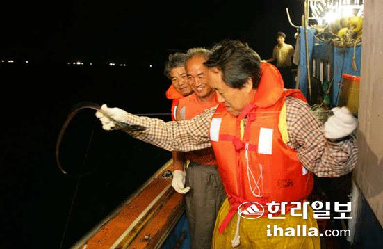 ▲김태환 도지사가 최근 고유가로 어려움을 겪는 어업인들의 고충을 체험하기 위해 8일밤 갈치조업에 나섰다. /사진=김명선기자