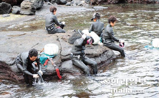 그들이 물속에서 걸어나오며 웃는 모습을 보지 못했다. 깊은 물에 들어 대여섯시간 자맥질을 반복하는 해녀들이 아닌가. 더욱이 카메라를 향해 포즈를 취하다니. 서귀포시 성산읍 성산일출봉 아래 우뭇개 포구에 가면 그런 풍경을 만난다. 지난해 8월부터 성산리어촌계 해녀중 80여명이 매일 두차례씩 '해녀 물질 공연'을 벌이고 있다.