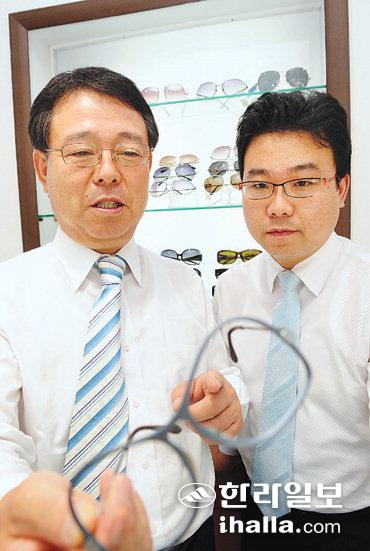 ▲30년째 안경점을 운영하고 있는 부응규씨(왼쪽)와 아들 문승씨가 신제품 안경을 들여다보며 얘기를 나누고 있다. /사진=이승철기자 sclee@hallailbo.co.kr