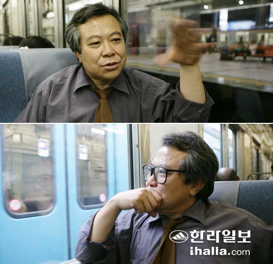 ▲오사카시내를 순환하는 전철 안에서 이야기를 나누는 소설가 김길호.
