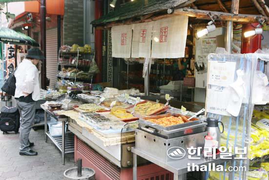 ▲조센이치바에는 김밥 파전 떡볶이 등 다양한 한국음식을 파는 가게가 여럿 있다.