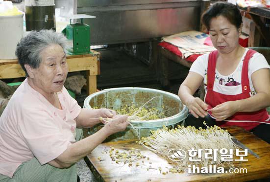 '이쿠노 아리랑'에서 고 할머니란 인물을 낳게 된 고기생씨(90)의 김치가게는 소설속처럼 성(姓)을 딴 간판을 달았다. 표선면 세화2리에 큰 아들이 있다는 할머니는 이른 시간부터 조카와 함께 콩나물을 다듬고 있었다. 서른을 겨우 남긴 나이에 아기를 두고 일본으로 왔다. 손에 물집이 생기도록 풀베기를 했고 월급을 제대로 못받으면서도 김치가게에서 일했다. 그래야 밥한끼라도 얻어먹을 수 있었다.