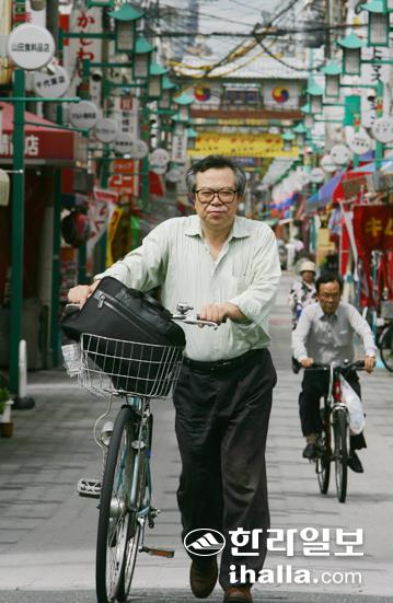 ▲자전거를 끌고 조센이치바를 찾은 소설가 김길호씨. 스물넷이란 청년기에 일본으로 밀항한 그는 이쿠노에 30년째 살면서 재일동포들의 속깊은 이야기를 소설에 담아내고 있다. /사진=김명선기자