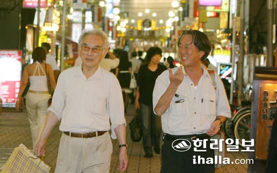 ▲작가 김석범이 조동현 도쿄 제주 4.3을 생각하는 모임대표와 함께 우에노의 밤거리를 걸어가고 있다.