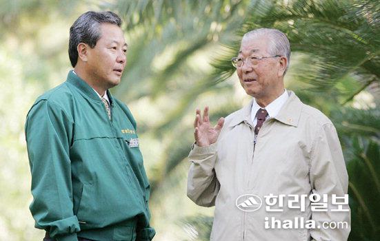 ▲협재·쌍용동굴, 석·분재원 등 8개 테마별로 이색 볼거리를 제공하고 있는 한림공원 창업주 송봉규 회장(오른쪽)과 대를 잇고 있는 둘째아들 송상훈 사장이 공원 야자수길에서 담소를 나누고 있다. /사진=김명선기자 mskim@hallailbo.co.kr