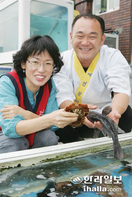 ▲제주시 서부두에서 대진횟집을 운영하는 곽동영·정유은씨 부부. 곽씨 부부는 "30여년 인기 비결은 신선한 맛과 친절한 서비스"라고 설명한다. /사진=김명선기자