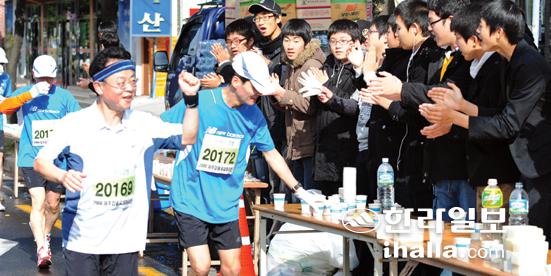 ▲22일 제주공항 입구에 마련된 제1급수대에서 제주중앙고등학교 학생들이 열띤 응원을 펼치며 달림이들의 원기를 불어 넣어주고 있다. 이날 중앙고 학생들은 행사장 곳곳에서 출발, 기록, 물품정리, 응원 등의 봉사활동을 펼쳤다.