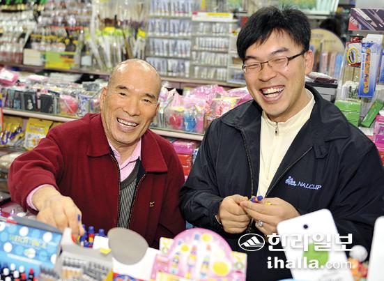 ▲1969년 제주시 중앙로에 '인천문화당'을 창업한 이삼성씨(사진 왼쪽)가 대를 이어 가업을 꾸려가고 있는 아들 이인식 대표와 환하게 웃고 있다. /사진=이승철기자 sclee@hallailbo.co.kr