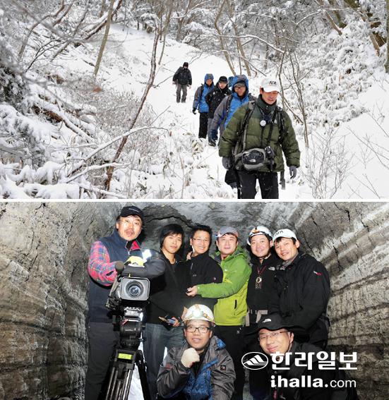 ▲어승생악에서 촬영에 나선 KBS역사추적 제작진(사진 위). 본보 일제전적지 탐사팀과 KBS역사추적 제작진이 송악산 해안 갱도에서 기념촬영을 하고 있다(사진 아래).