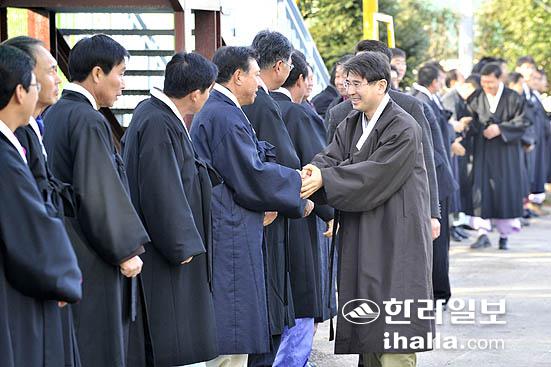 민족 고유의 명절인 설을 맞아 27일 도내 각 마을마다 새해 합동세배 행렬이 이어진 가운데 서귀포시 하효마을회관(마을회장 강경호)에서 주민들이 마을 어르신들을 모시고 세배를 올리며 덕담을 나누고 있다./사진= 강경민기자
