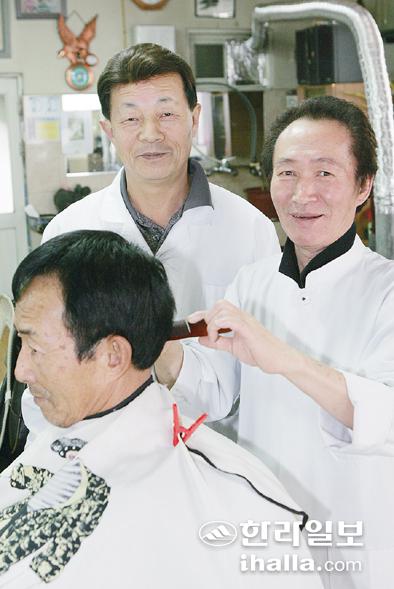 ▲삼양동에서 이용원을 운영하고 있는 강창해씨(왼쪽)와 문응철씨는 50년 경력의 이용사들로 쉬는 날이면 함께 이용봉사활동도 다니고 있다. /사진=김명선기자