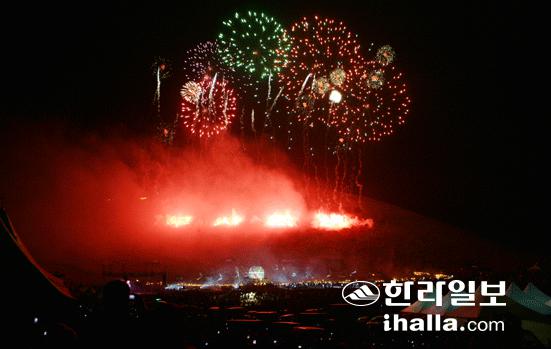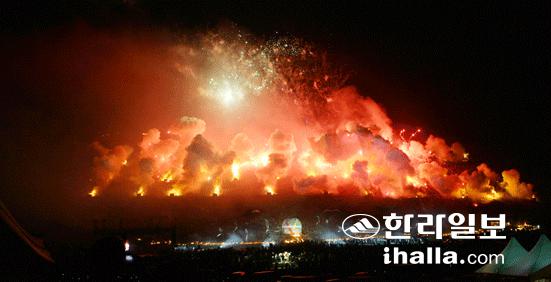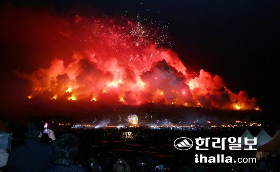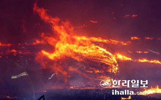 ▲14일 저녁 제주시 애월읍 봉성리 새별오름에서 진행된 정월대보름 들불축제 마지막날 오름불놓기 행사에서 달집이 활활 타오르고 있다. /사진=김명선기자
