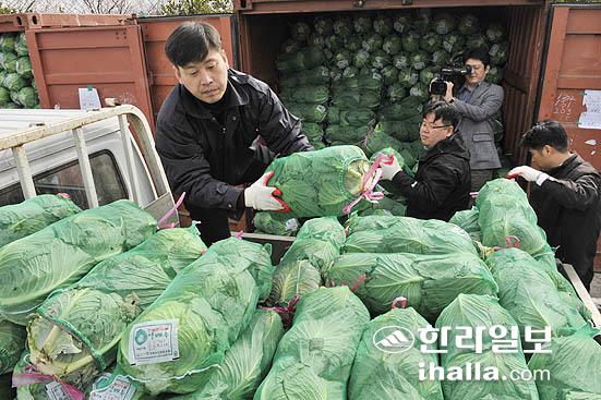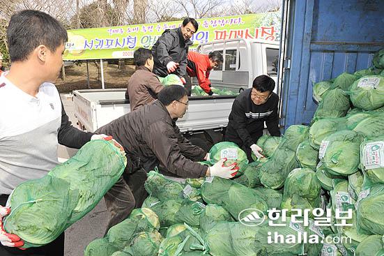 최근 과잉생산으로 처리난을 겪는 양배추 소비촉진 일환으로 18일 서귀포시는 제2청사에서 양배추 일일 판매시장을 열고 있다./사진= 강경민기자
