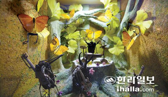 ▲팔랑이는 나비를 배경으로 곤충들이 숲속 연주를 벌이고 있다. 프시케월드는 스토리가 있는 나비박물관으로 꾸며졌다. /사진=김명선기자